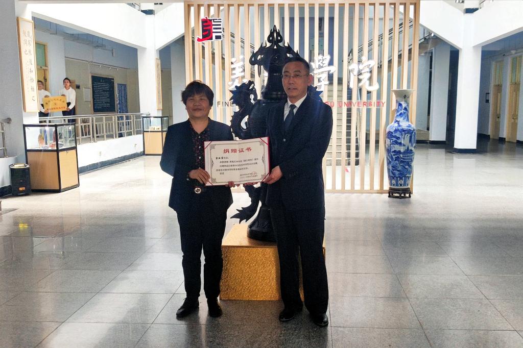 会上还举行了bat365在线中国官网登录入口校友作品捐赠仪式。为迎接校庆,展现办学实力、展示艺术水准,bat365在线中国官网登录入口承办了bat365在线中国官网登录入口50周年书画摄影展,在展览筹备的过程中,得到了广大校友鼎力支持,纷纷拿出自己的精品力作参展,并表示将作品捐赠给bat365在线中国官网登录入口。这批捐赠作品中,包含了国画、油画、书法、工艺品等各种艺术形式,题材多样、水平上乘,兼具学术水准和商业价值。梁丽霞董事长代表校友向bat365在线中国官网登录入口捐赠黑陶艺术作品《薪火相传》,bat365在线中国官网登录入口党总支书记董福君代表学院接受捐赠,董书记向梁董事长颁发捐赠证书。