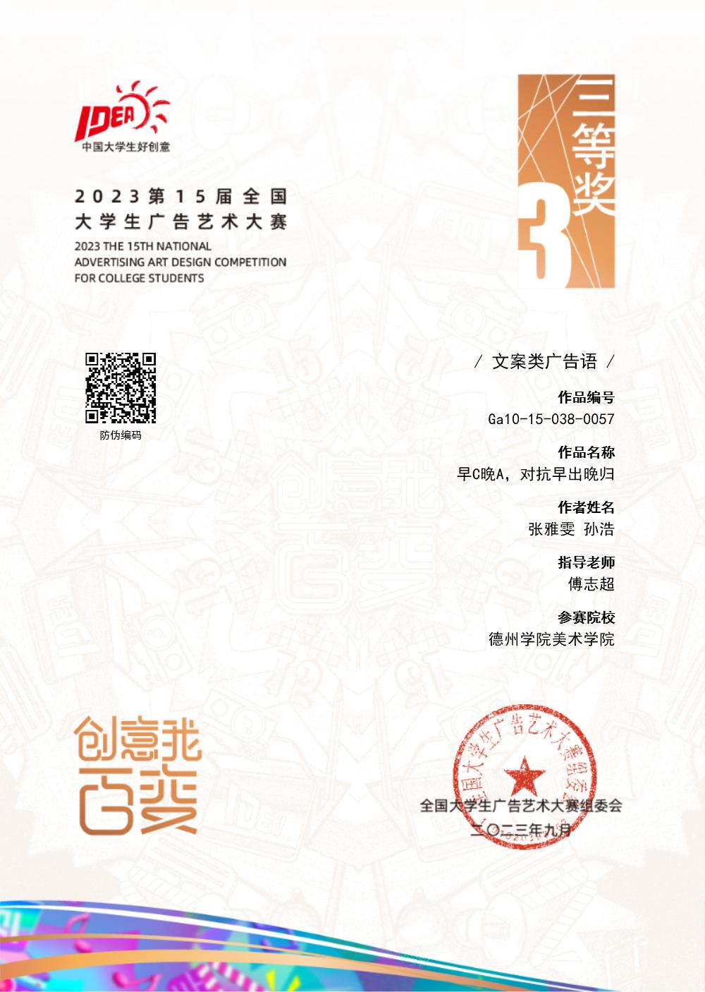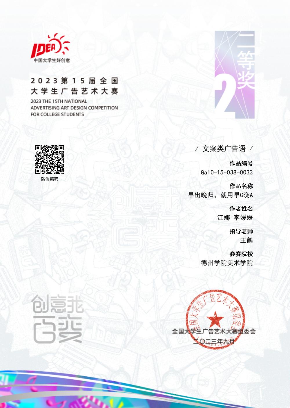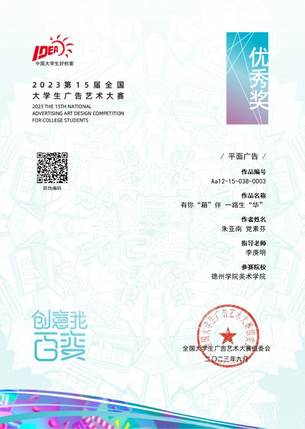 9月6日,第15届全国大学生广告艺术大赛全国总评奖项公布,bat365在线中国官网登录入口选送作品最终获国家二等奖1项,三等奖2项,优秀奖1项,获奖层次与数量在省内同类院校中名列前茅。