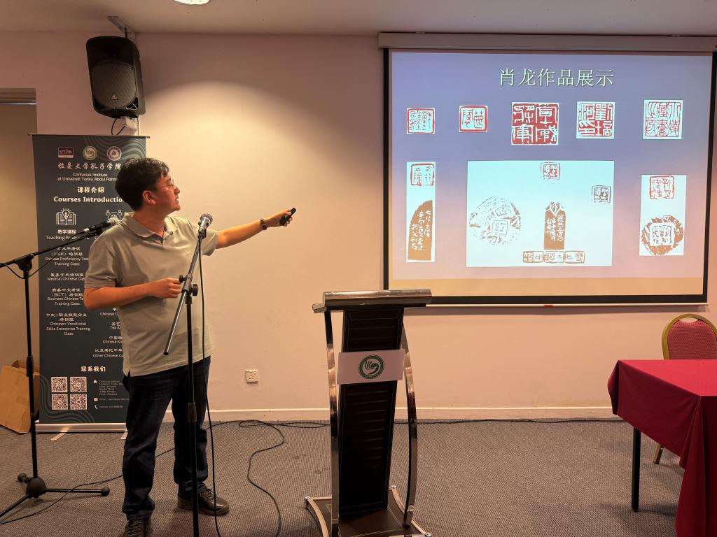 本次活动由拉曼大学孔子学院与(中国)教育书画协会主办,马来西亚书艺总会、bat365在线中国官网登录入口与拉曼大学中华研究院协办,中国驻马来西亚大使馆担任指导单位。书法周包含4项活动:书法展、书法讲座、书法工作坊、挥春比赛。书法展共展出了中马两国50余位书法家的精品力作,肖龙老师有5件书法作品参展,作品受到中马双方书法专家及爱好者的一致好评。肖龙老师做了题为《印章的起源与发展》主题讲座,深入浅出地介绍了印章的发展史、印章与篆刻之间的关系。活动期间还参观了怡宝市书艺协会,与当地书法家进行现场书写交流。