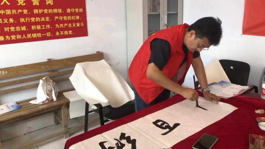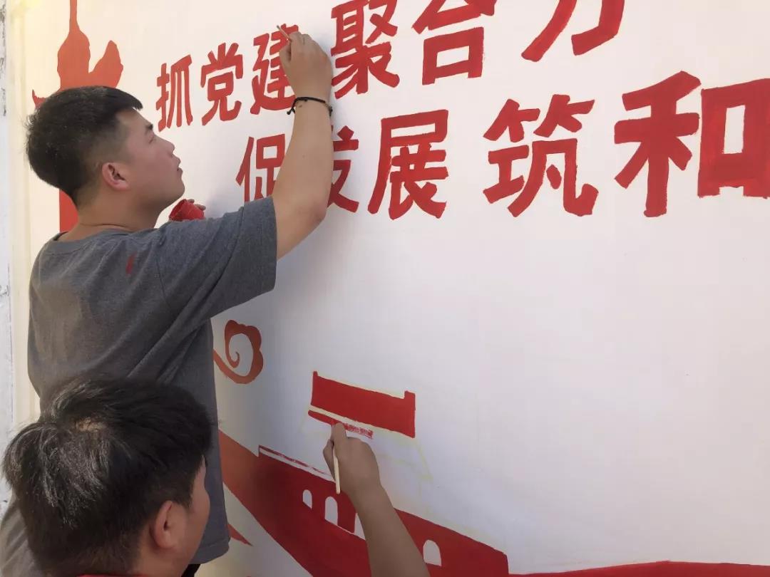 教师党员肖龙为村民们书写了《国泰民安》、《民康物阜》、《福寿康宁》等书法作品,并为村民简单讲解了每幅书法作品的运笔技法和寄托的美好寓意。此外,师生党员在深入调研当地人文风貌与生活方式基础上,以“礼赞新中国”为主题为董羊皮村党支部绘制近50㎡墙体,学院将社会调研与手稿设计、现场创作融合贯通起来,把支部院墙变为宣传习近平新时代中国特色社会主义思想的主阵地,是bat365在线中国官网登录入口落实“不忘初心、牢记使命”主题教育的具体行动。