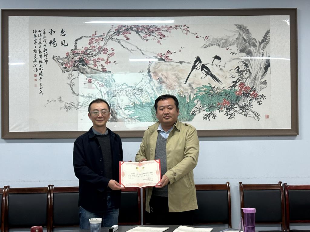 会后聊城大学美术与设计学院院长张兆林为王鹤副院长颁发兼职研究生导师聘书。